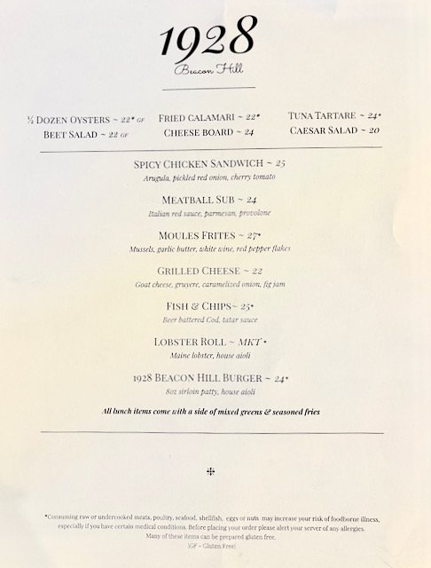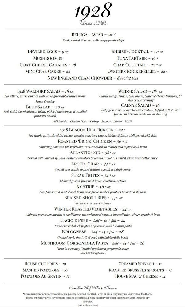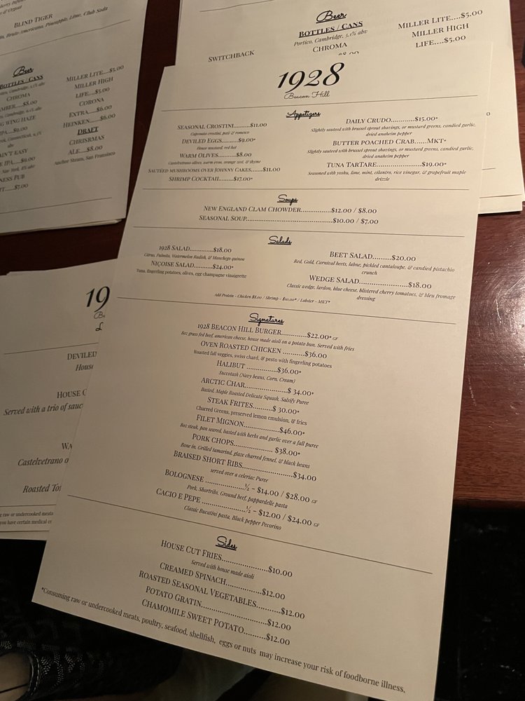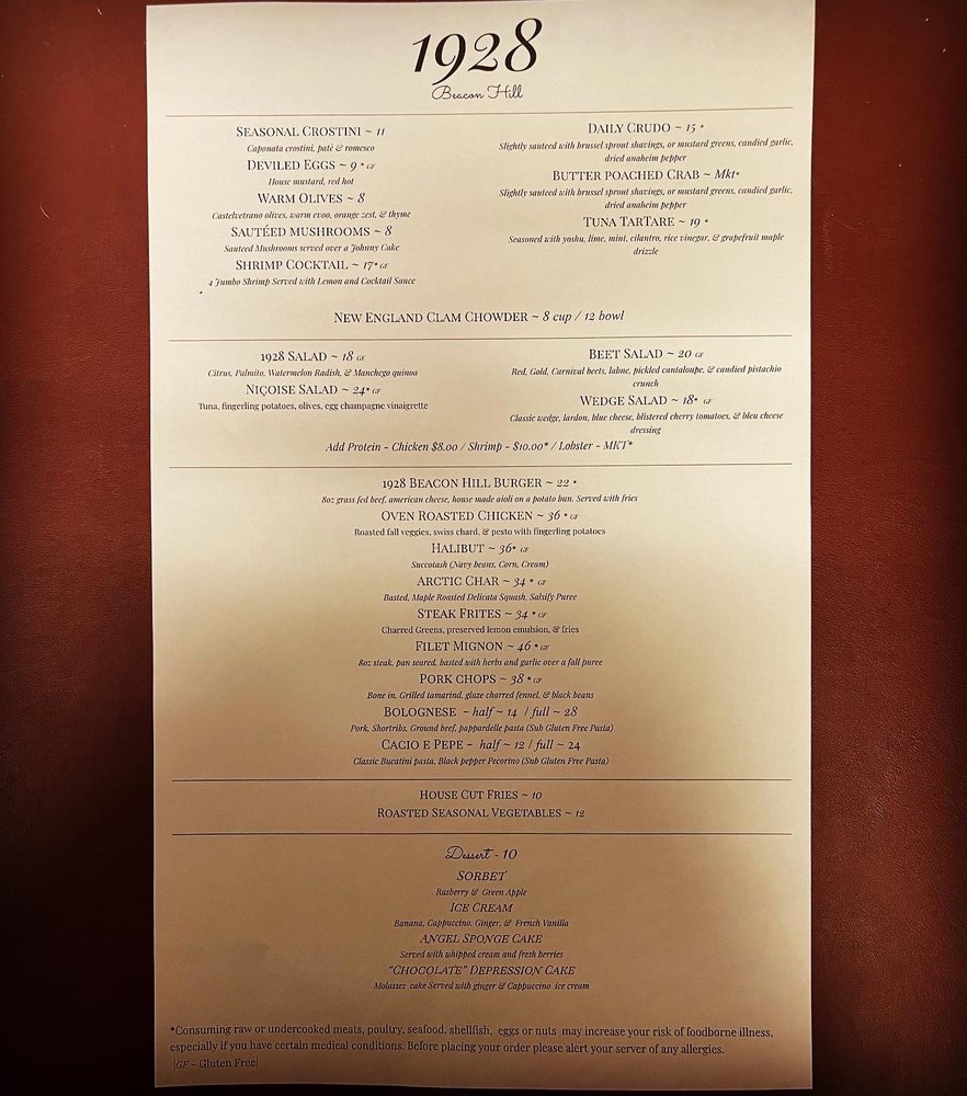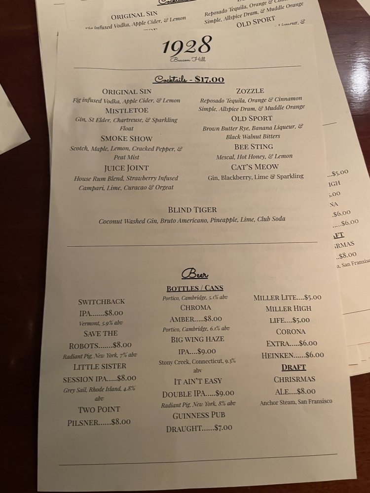 Introducing the menu at 1928 Beacon Hill, a steakhouses-bar offering American cuisine in Boston. With a classy atmosphere and a mix of old Hollywood and vintage Miami vibes, this women-owned establishment caters to all, offering vegan options and gender-neutral restrooms. The menu boasts dishes like coconut shrimp, clam chowder, oysters, Caesar salad, filet mignon, lobster bisque, and a variety of cocktails. Customers rave about the delicious food and excellent service, with standout items like the spicy Bloody Mary and creme brulee served in a pineapple. While some dishes may not reach the highest ratings, the overall dining experience is complemented by the cozy interior, attentive staff, and unique ambiance that make 1928 Beacon Hill a must-visit spot in Boston.